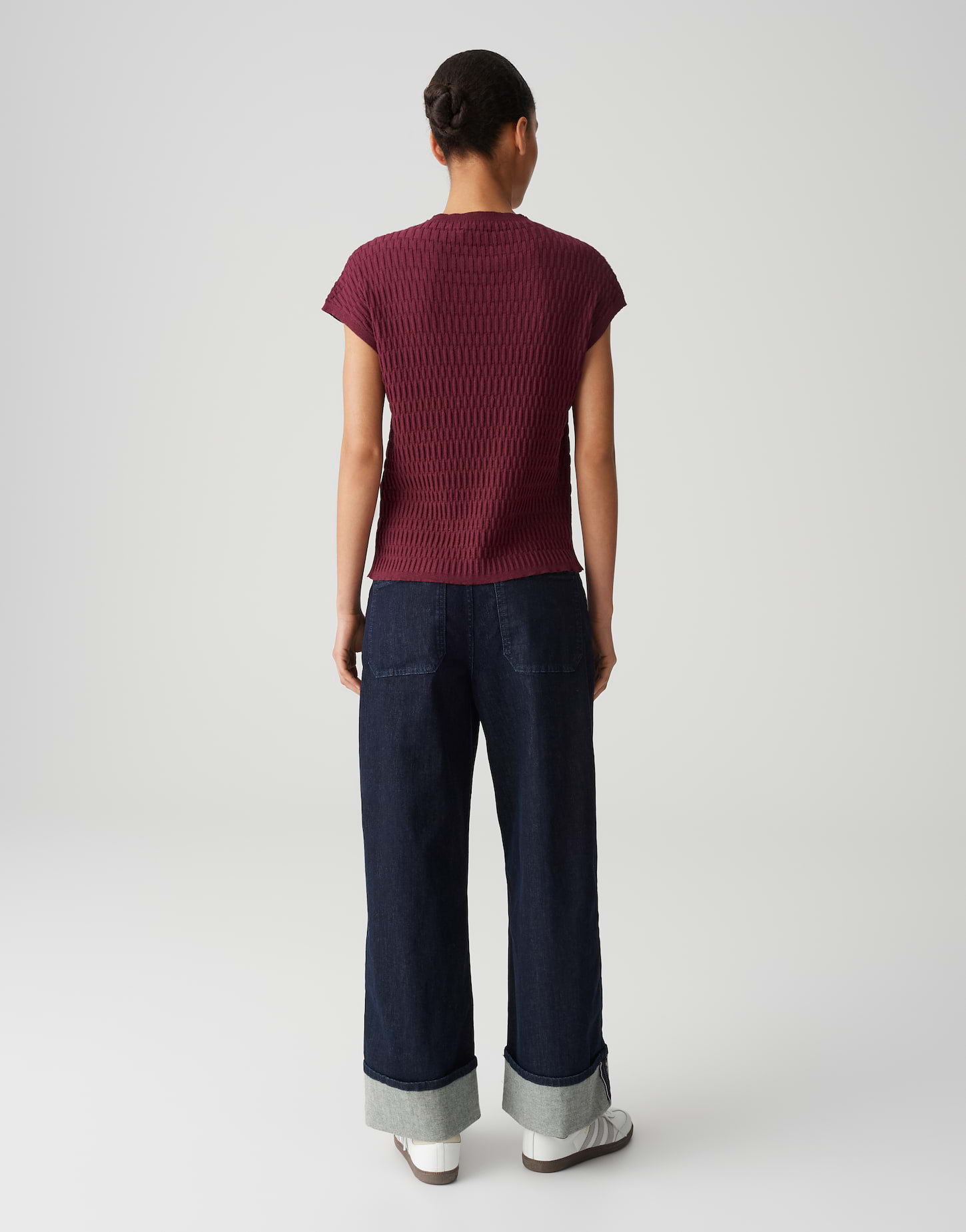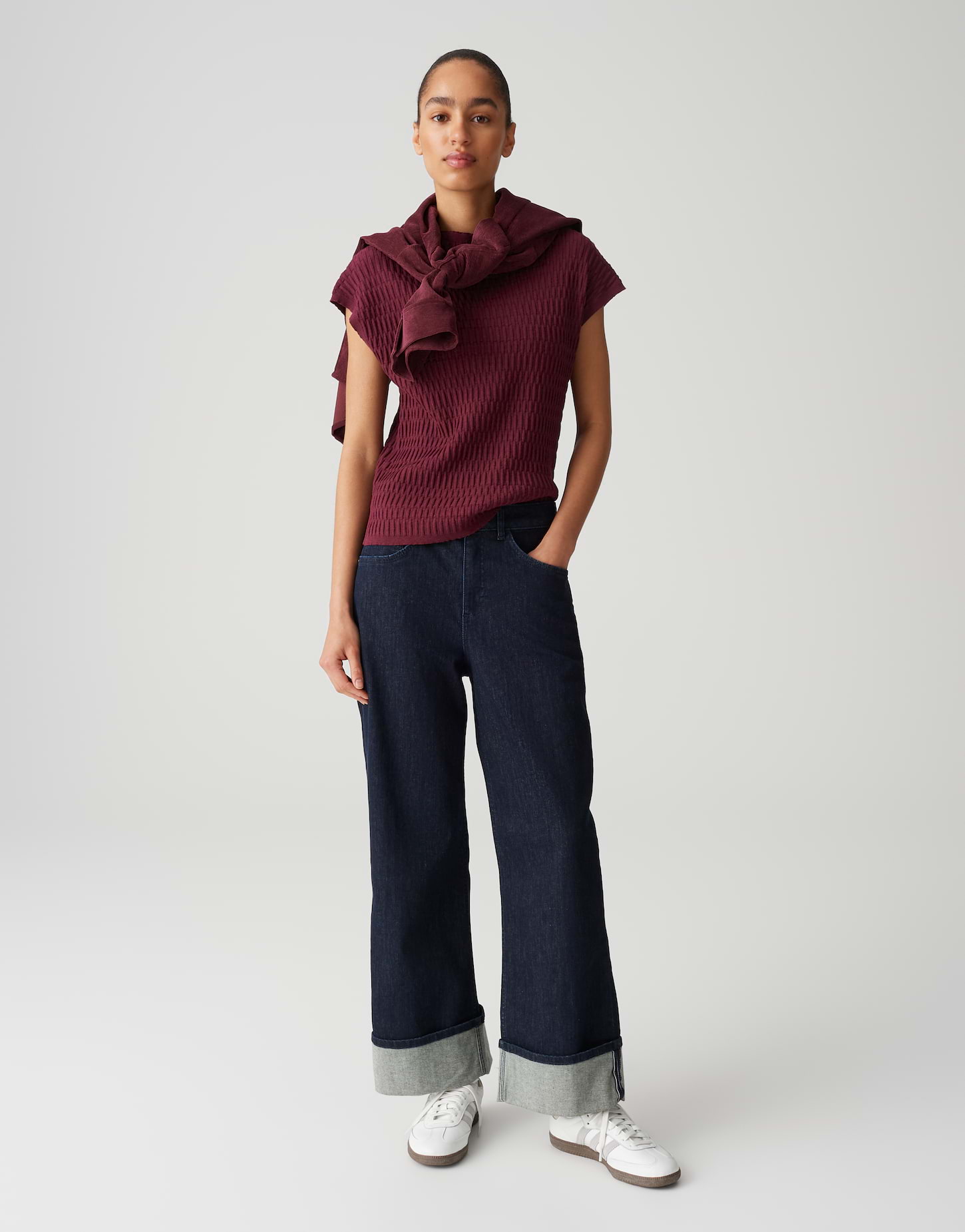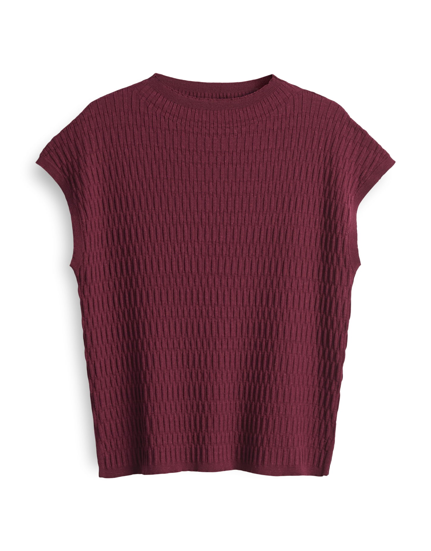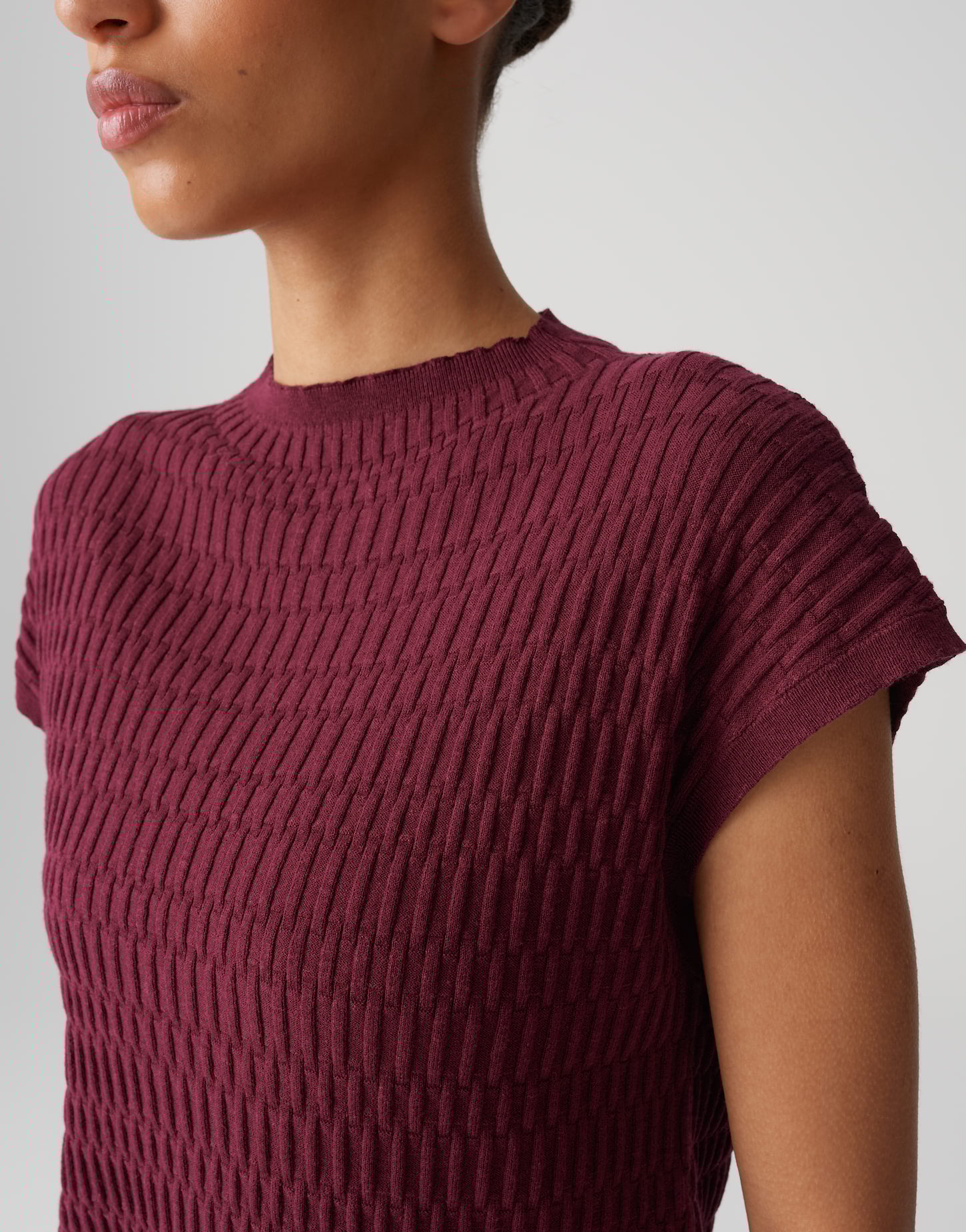 schmale Passform, gerader Schnitt, überschnittener Kurzarm, Rückenlänge ca. 57 cm bei Größe 36, Model Größe 177 cm – trägt Größe 36, Feinstrick, 3-dimensionale Struktur, natürlicher Griff, fließender Fall, schmale Rippbündchen, kleine Schlitze in den Seiten