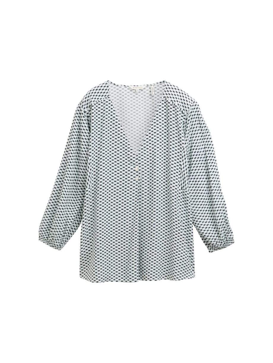 * Gemusterte Bluse mit V-Ausschnitt und 3/4-Arm. Mit Faltenlegung und dekorativen Knöpfen auf der Vorderseite. Aus einem weichen Viskose-Stoff.
