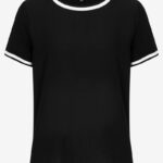 Das feminine Shirt von MORE & MORE mit hellen Kontrast-Abschlüssen und fließender Webfront bietet eine tolle Mischung aus Bluse und T-Shirt.