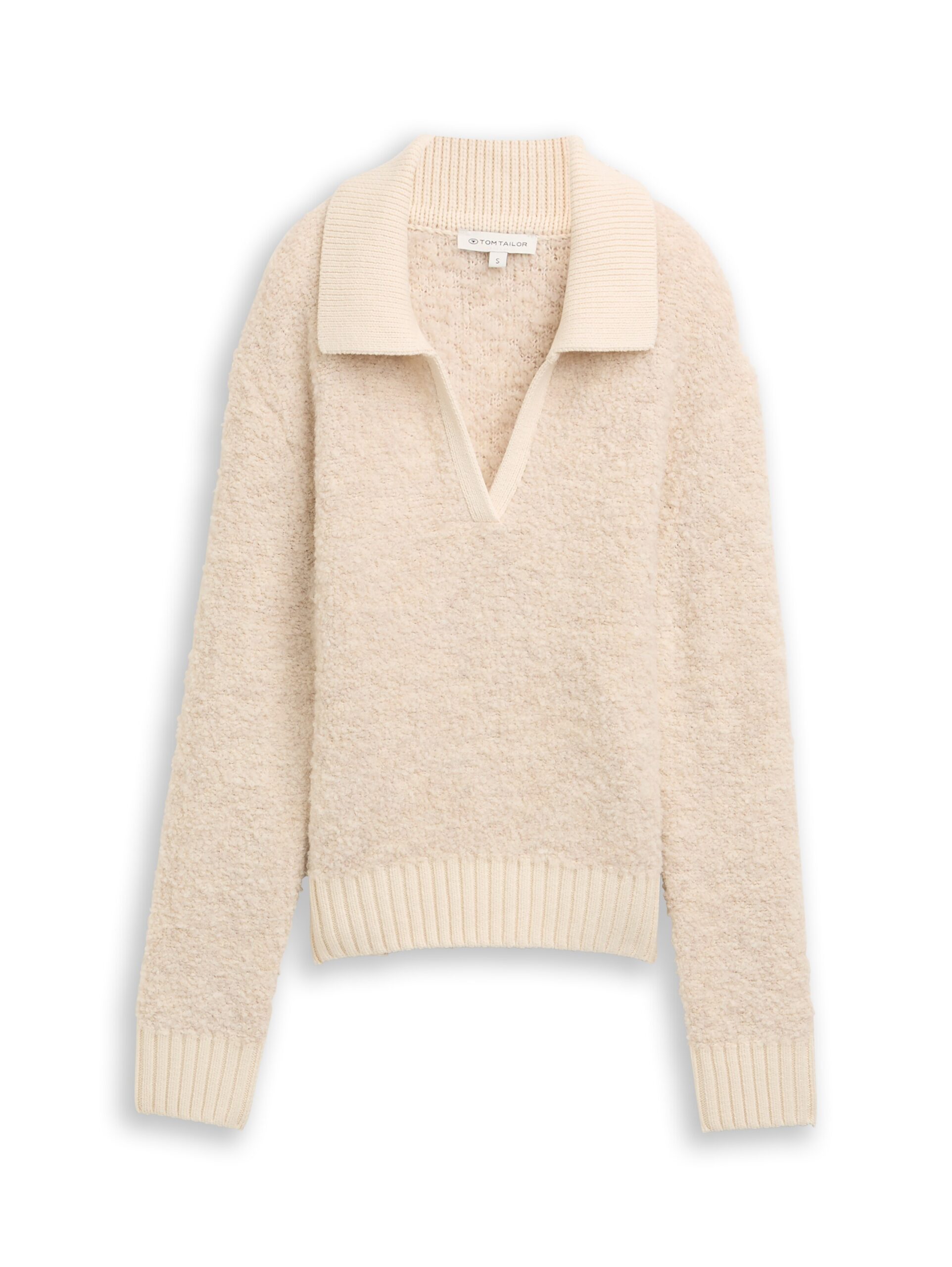 Bouclé Pullover im Troyer-Look mit Kragen und V-Ausschnitt. Aus einem weichen Strickmaterial mit Wollanteil für ein besonders warmes und angenehmes Tragegefühl.