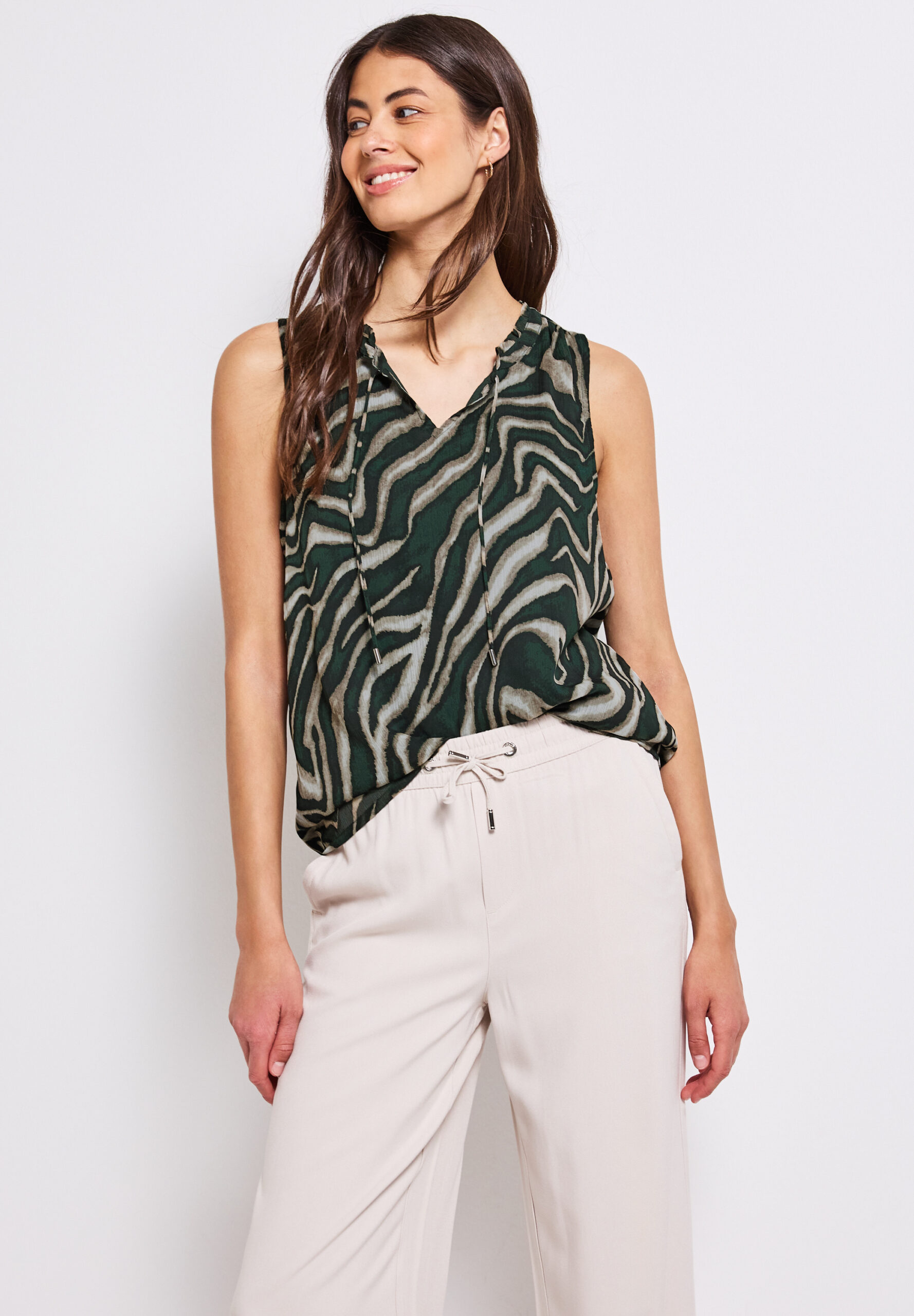 Dieses ärmellose Chiffon-Top von Street One für Damen begeistert mit einem grafischen Print und einem geschlitzten Ausschnitt samt Bändern. Der weich fallende Stoff sorgt für modernes Flair, während der angenehme Tragekomfort es zum idealen Sommerteil macht. Ärmellose Bluse Geschlitzter Ausschnitt mit Bändern Grafisches Muster Weich fallend Angenehmer Tragekomfort Material: Obermaterial: 100% Polyester; Futter: 100% Modal