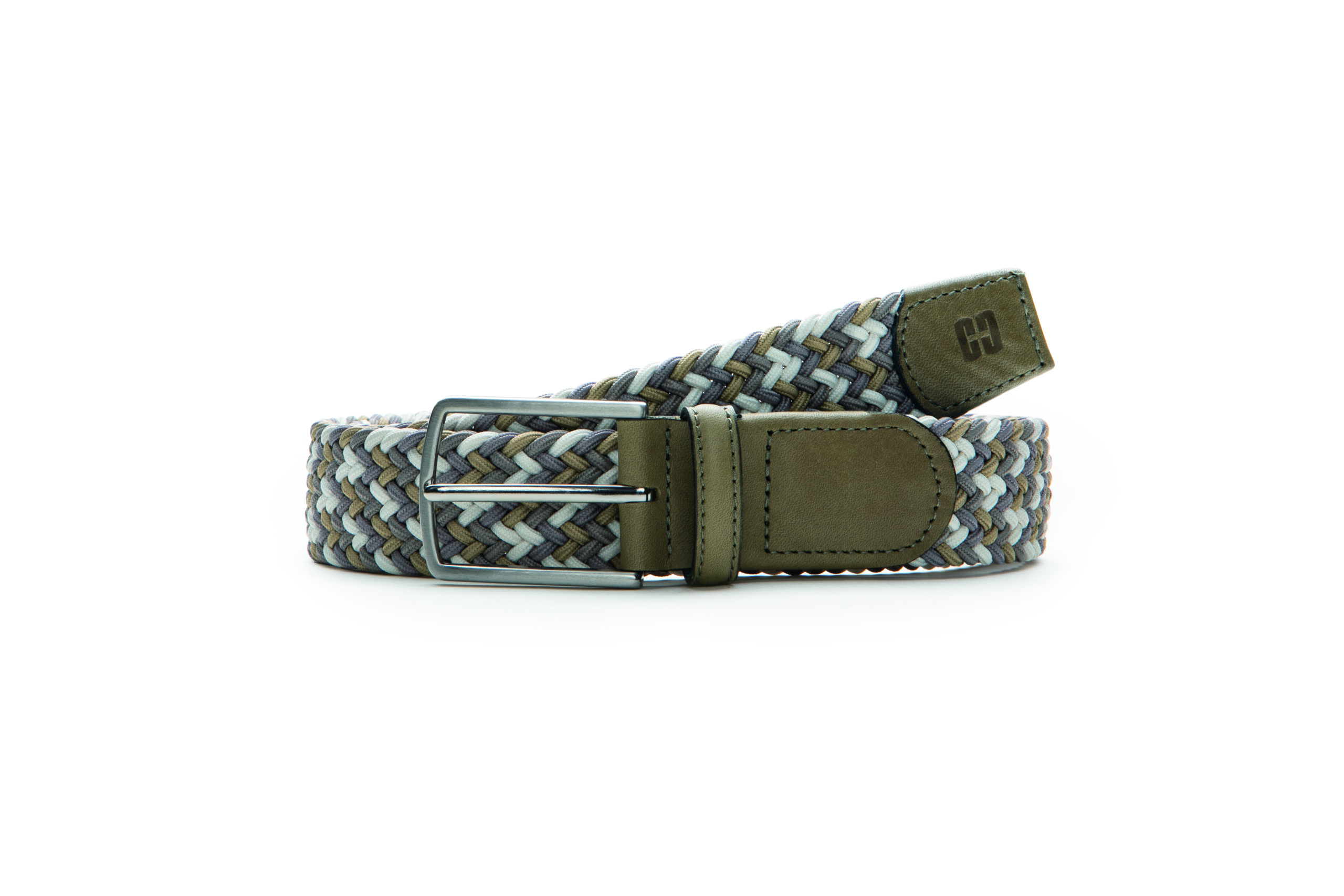 Sportiver, elastischer Two-Tone-Flecht-Bandgürtel mit Logoprägung in der Lederspitze. Dazu die polierte Metallschließe. Breite 3,4 cm, Längen: 90-125 cm
