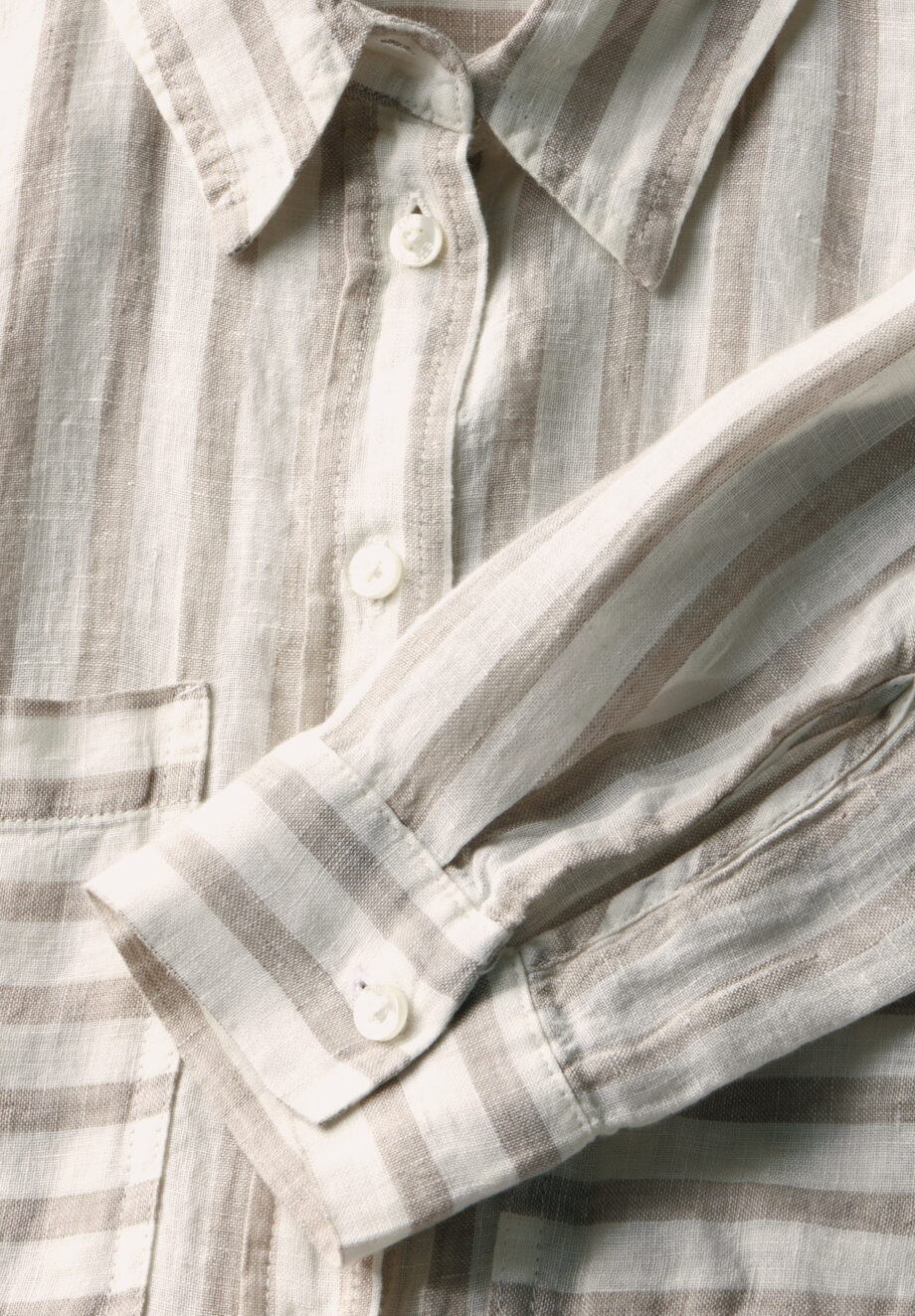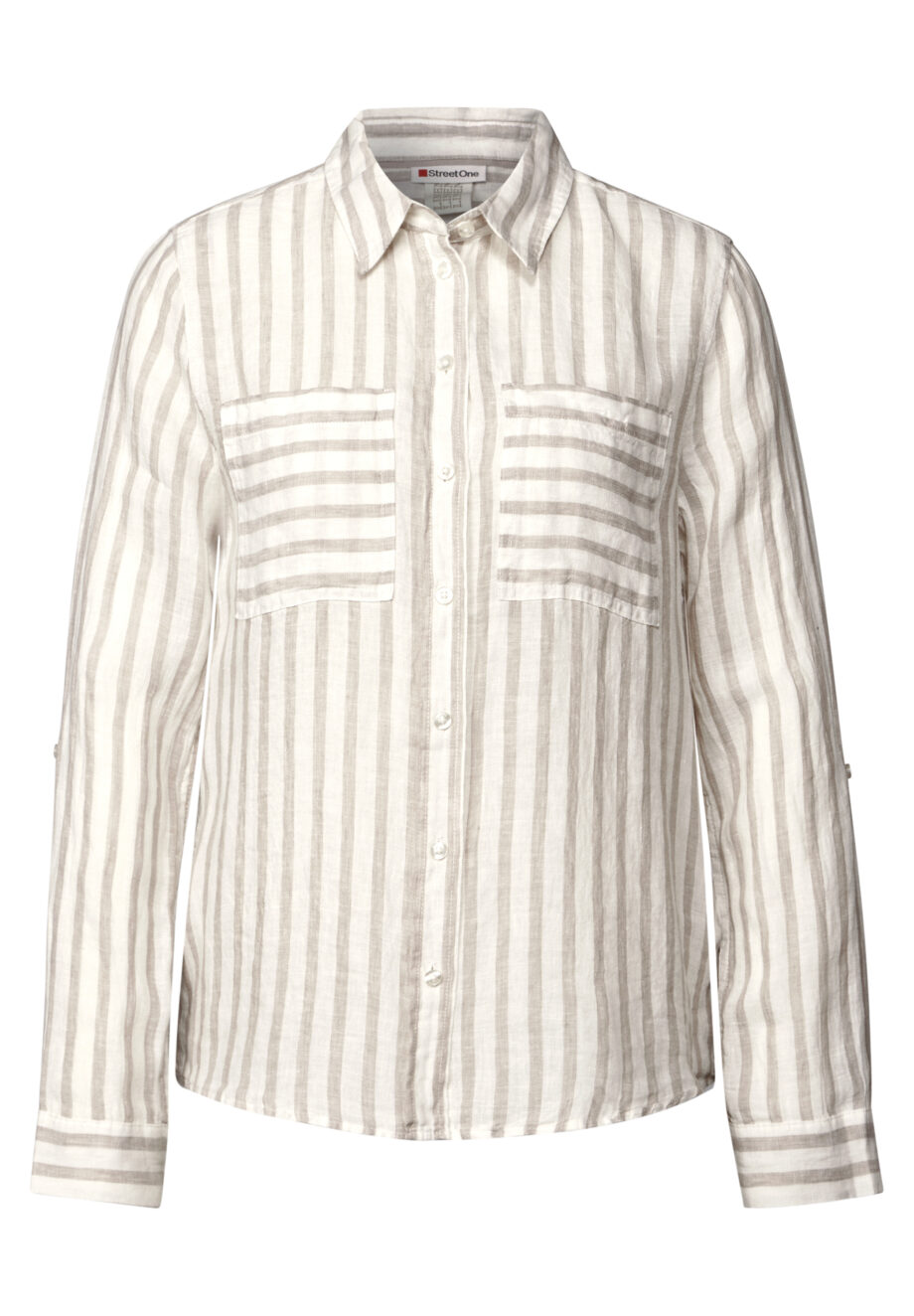 Die gestreifte Hemdbluse von Street One für Damen punktet mit einem zeitlosen Look. Der Hemdkragen, die Brusttaschen und der Turn-Up-Langarm machen sie besonders vielseitig. Die leichte Leinenqualität sorgt für ein angenehmes Tragegefühl. Bluse mit Brusttaschen Hemdkragen Langarm mit Turn-Up Gerundeter Saum Leichte Leinenqualität Material: 100% Leinen