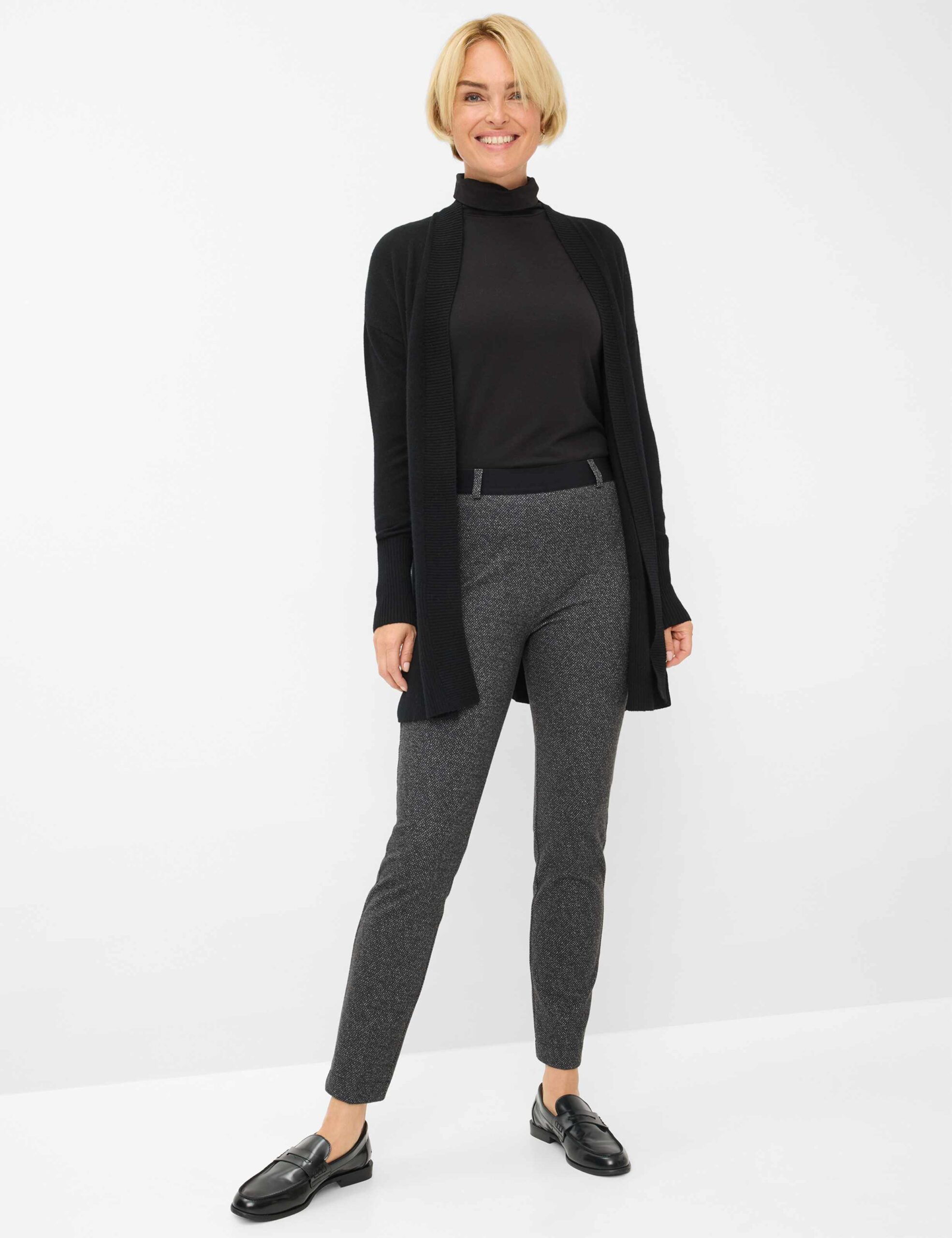Klassisch, bequem und mit modischem Feinsinn: Diese Jersey-Schlupfhose im Style LILLITH mit moderner Silhouette. Die super schlanke Passform mit hoher Leibhöhe betont gekonnt die Figur, während der bequeme Schlupfbund ein angenehmes Tragegefühl garantiert. Die Bügelfalte streckt optisch das Bein und sorgt für eine gepflegte, cleane Linie. Dezente Reißverschlusstaschen ergänzen das Design funktional und dezent. Das feine Tweed-Muster bringt subtilen Strukturcharakter ins Spiel und wirkt gleichzeitig klassisch und zeitgemäß. Das Material aus Polyester, Viskose und Elasthan überzeugt durch weichen Griff, zuverlässige Formstabilität und angenehme Bewegungsfreiheit. Die Viskose sorgt für ein atmungsaktives Tragegefühl, während der Elasthananteil den körpernahen Fit perfekt unterstützt. So entsteht ein unkompliziertes Styling-Piece mit hohem Tragekomfort – ideal für modebewusste Frauen, die auf Qualität und Alltagstauglichkeit setzen.