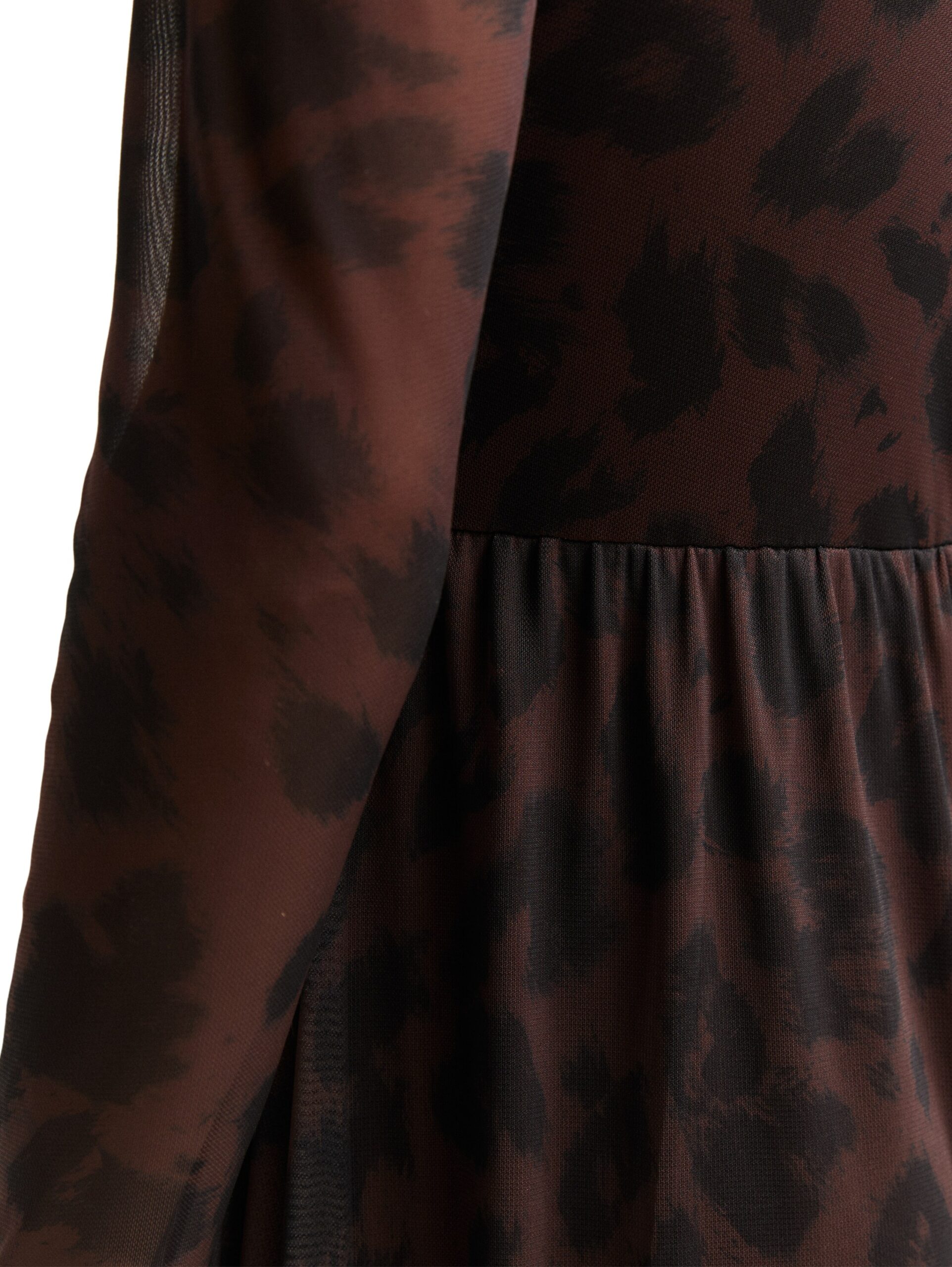 Gemustertes Midi-Kleid aus einem fließenden, knitterarmen Mesh-Stoff mit semi-transparenten Ärmeln. Mit kleinen Raffungen an der Taille und Knopfverschluss auf der Rückseite.