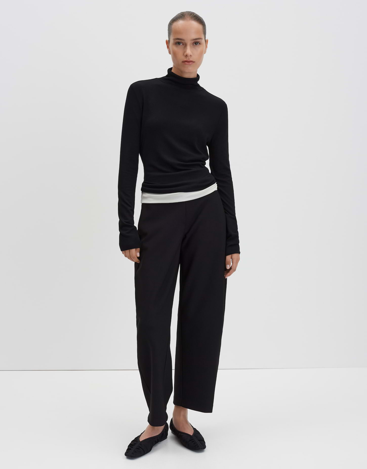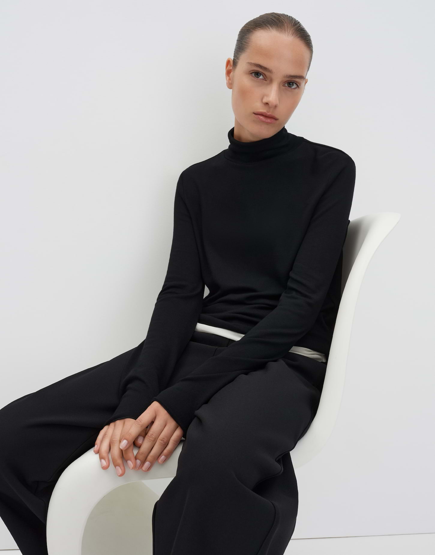 Das Rollkragenshirt aus nachhaltigem Viskose-Mix überzeugt mit figurumspielender Passform und angenehm weichem Griff. Die dekorative Rollsaumkante verleiht dem Longsleeve einen feinen Akzent und macht es zu einem vielseitigen Basic.