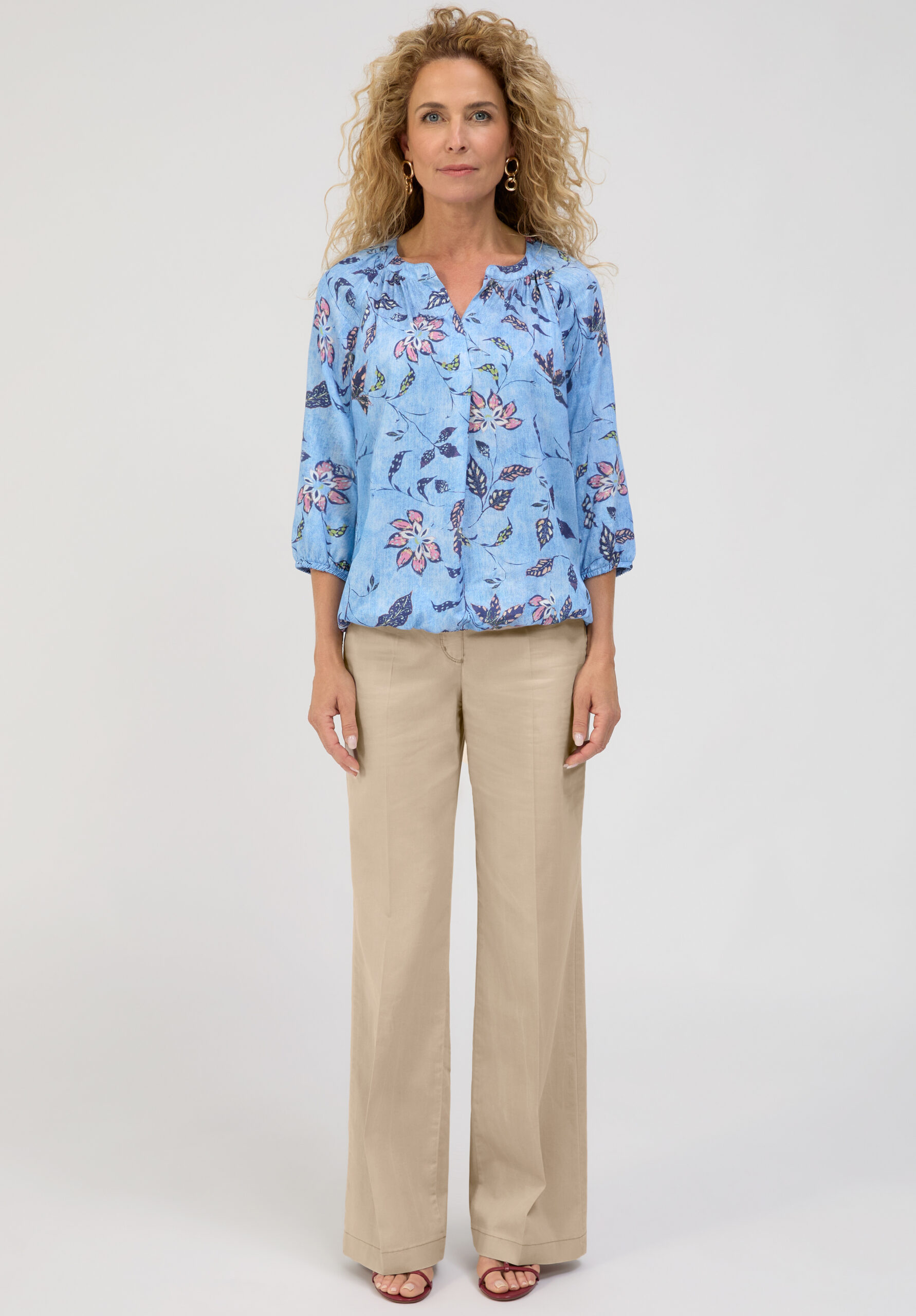 Unsere coole Schlupfbluse Rana bringt frischen Schwung in Ihre Garderobe. Das angesagte florale Allover-Dessin und der Rundhalsausschnitt mit kleinem Schlitz setzen modische Akzente. Der 3/4 Arm mit Gummizug sowie der elastische Saum sorgen für eine lockere, bequeme Passform. Aus 100 % Viskose gefertigt, trägt sich Rana angenehm leicht und ist ein vielseitiger Begleiter für stilvolle Alltagslooks.