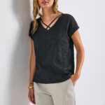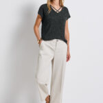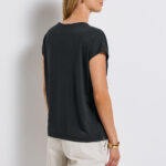 Das Sommershirt von Street One für Damen fällt durch seinen gerundeten V-Ausschnitt mit dekorativen Bändern ins Auge. Die Vorderseite im strukturierten Materialmix trifft auf eine stretchige Jersey-Rückseite – für ein harmonisches Tragegefühl. Dropped Shoulders runden den Look lässig ab. Sommershirt Gerundeter V-Ausschnitt mit Bändern Dropped Shoulders Vorderseite aus Materialmix mit Stretchanteil Jersey-Rückseite aus Viskosemix mit Stretchanteil Material: Rückseite: 95% Viskose, 5% Elasthan; Vorderseite: 77% Polyester, 20% Viskose, 3% Elasthan