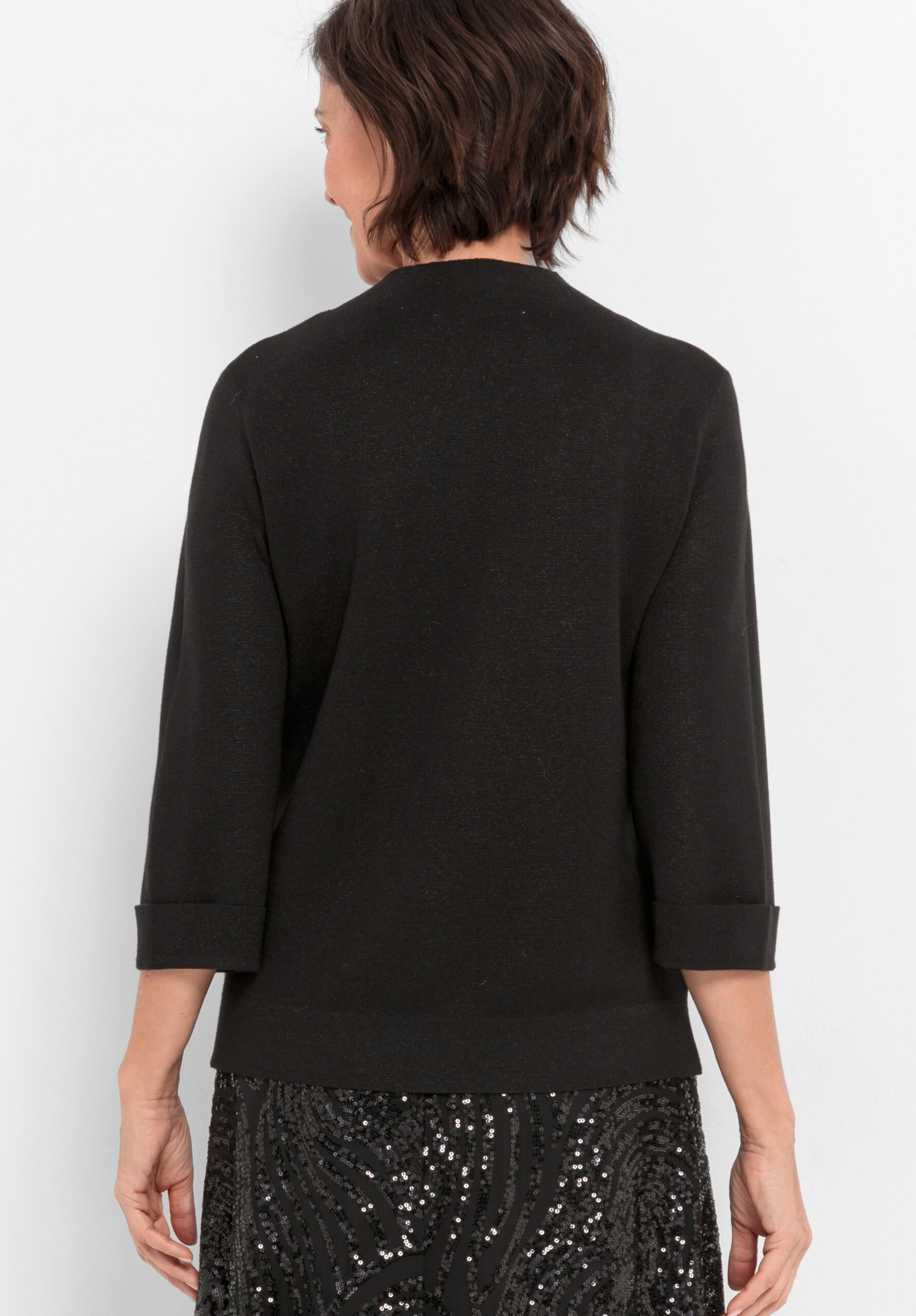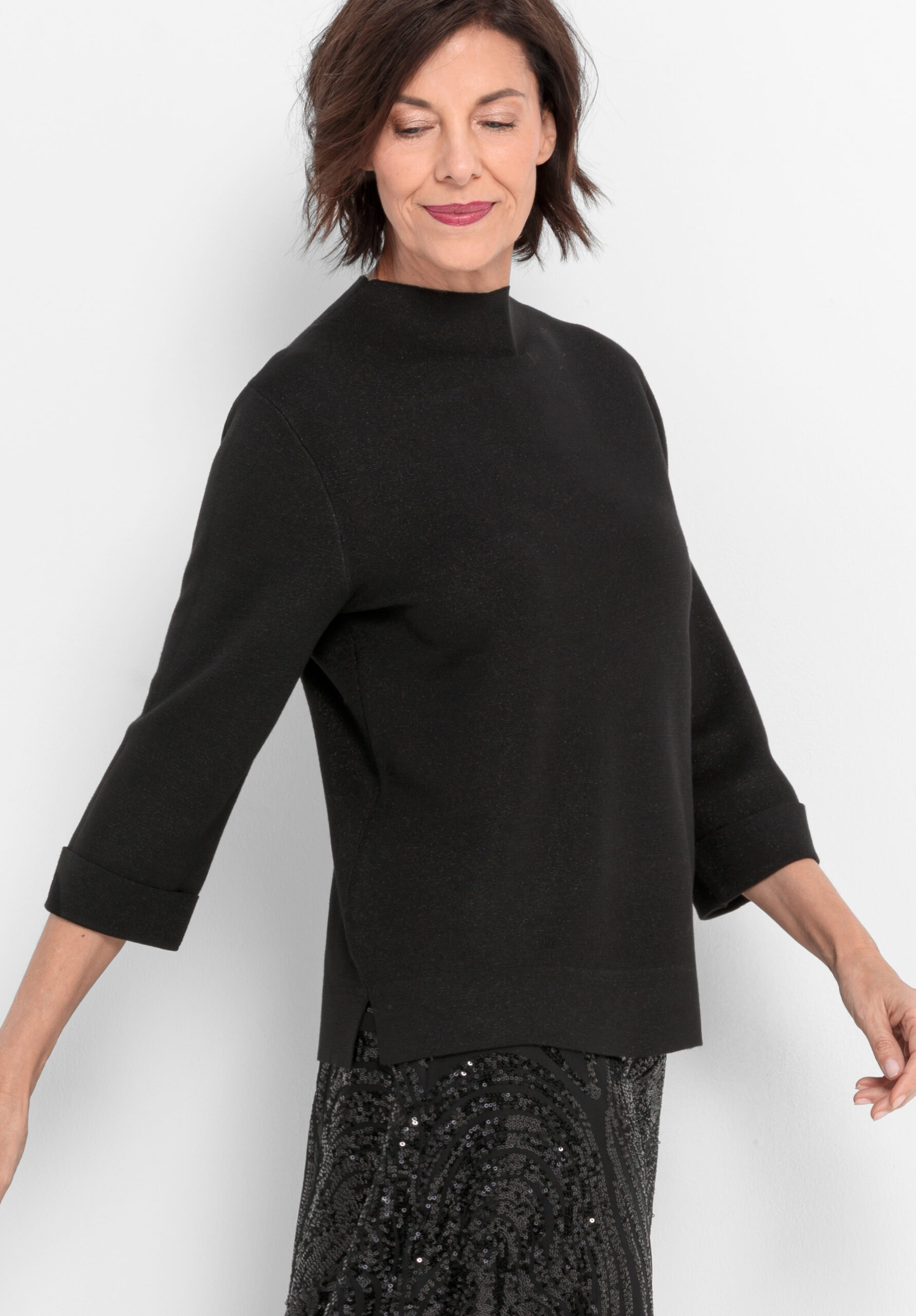 Unser neuer Strickpullover Nele überzeugt mit modernem Turtle-Neck, weitem 3/4-Arm mit breitem Saumaufschlag und edlem, matt schimmerndem Milano-Strick. Das weiche Material sorgt für hohen Tragekomfort, während der elegante Look Selbstbewusstsein ausstrahlt. Nele ist ein vielseitiges Statement-Piece, perfekt fürs Büro oder als stilvolles Layering-Highlight an kühleren Tagen.