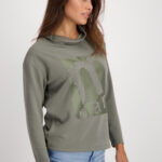Durch den tonigen, glänzenden Satin Druck mit funkelndem Strass kommt das sanfte Sweatshirt mit Stehkragen stilvoll zur Geltung.