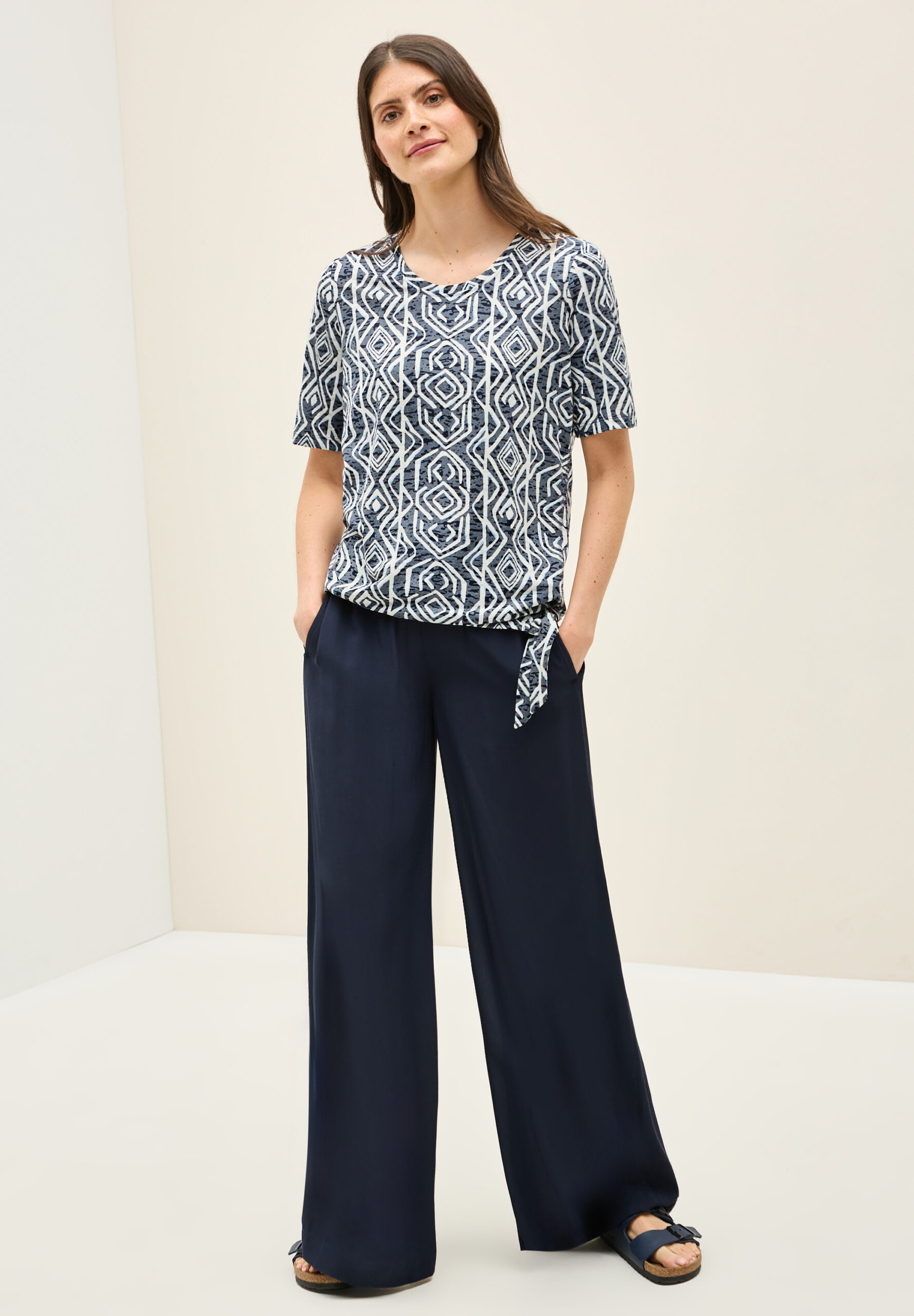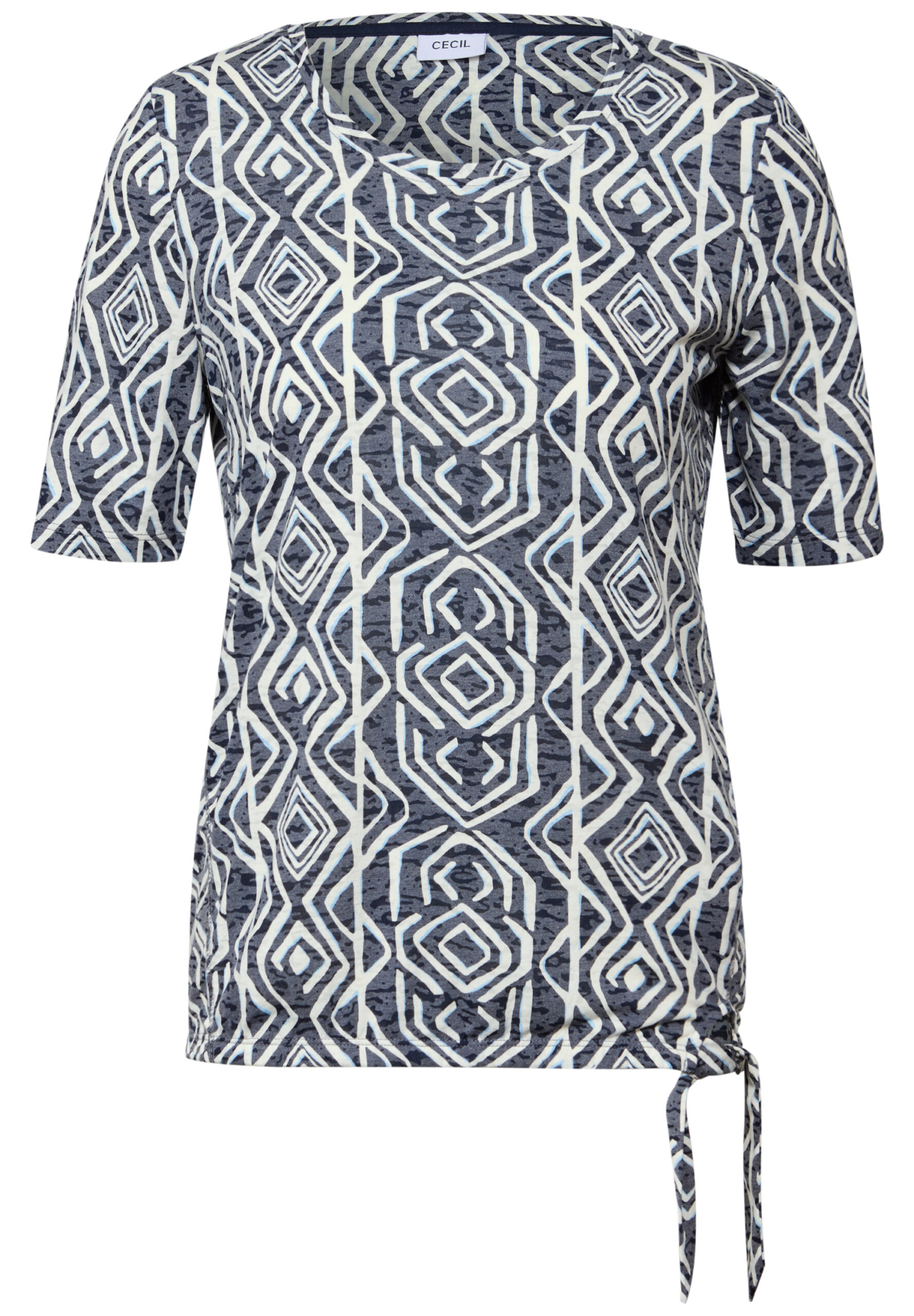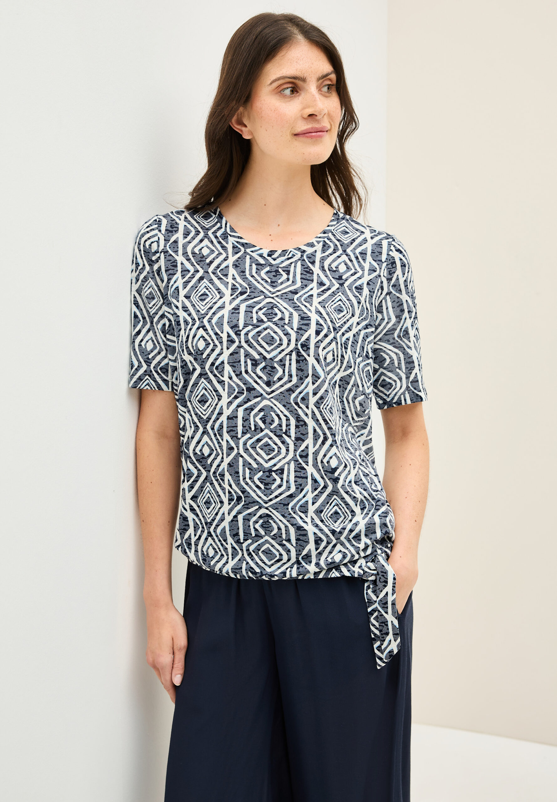 Dieses T-Shirt von CECIL für Damen bringt mit grafischem Muster und Ausbrenner-Optik trendige Leichtigkeit in deinen Look. Der elastische Saum mit Knoten-Detail sorgt für eine lässige Passform. Weich, leicht und ideal für entspannte Sommermomente. Kurzarmshirt Rundhalsausschnitt Grafisches Muster Elastischer Saum mit Knoten-Detail Weich und leicht Material: 65% Polyester, 35% Viskose