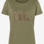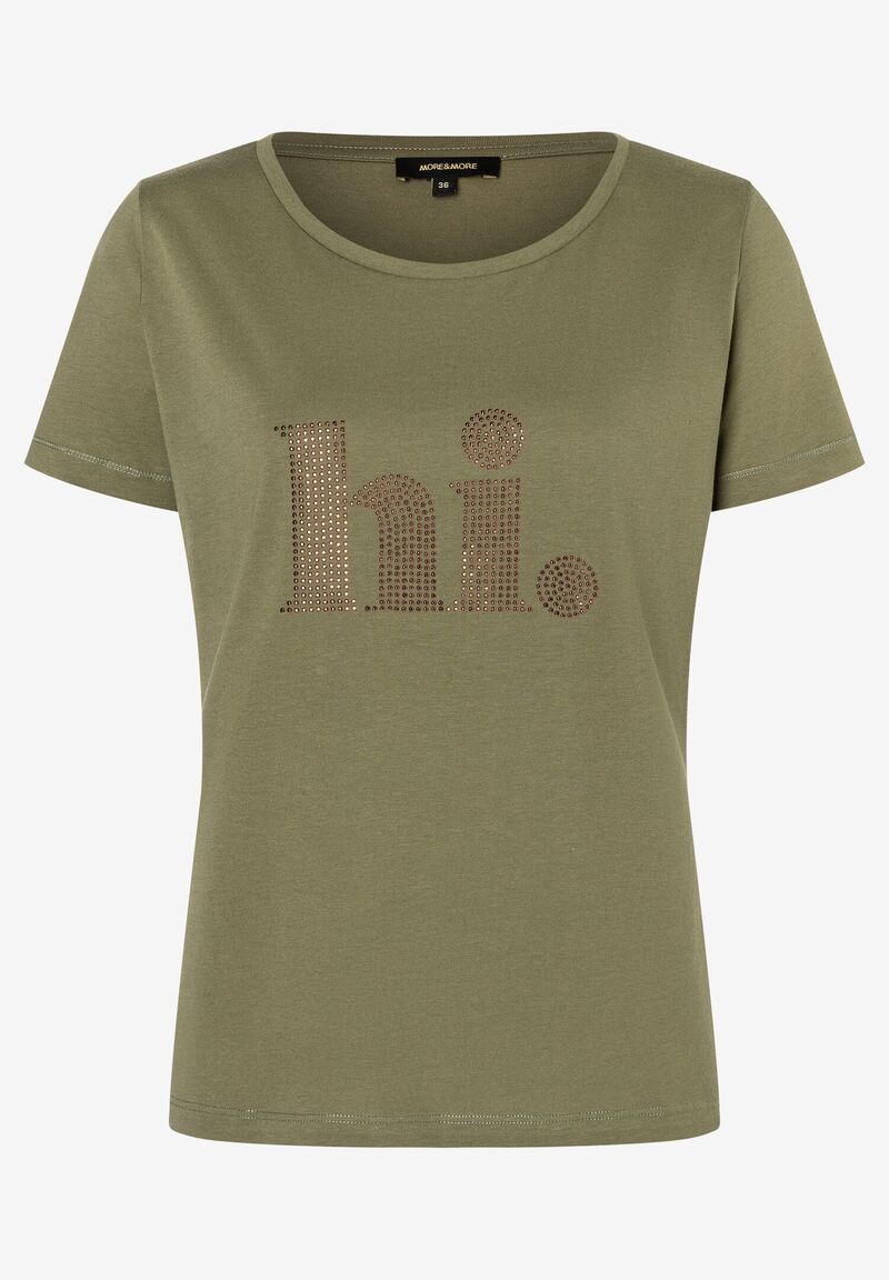 Das moderne T-Shirt von MORE & MORE mit rundem Ausschnitt und goldfarbener Steinchen-Schrift auf der Front ist ein absoluter Allrounder und passt zu allem.