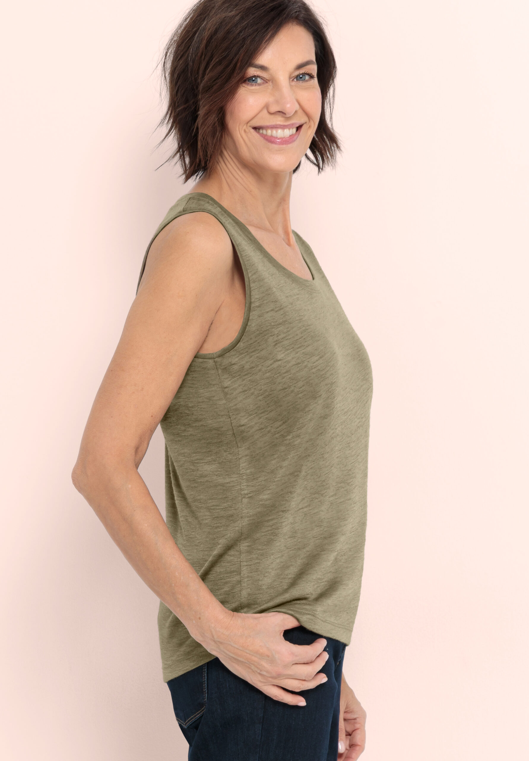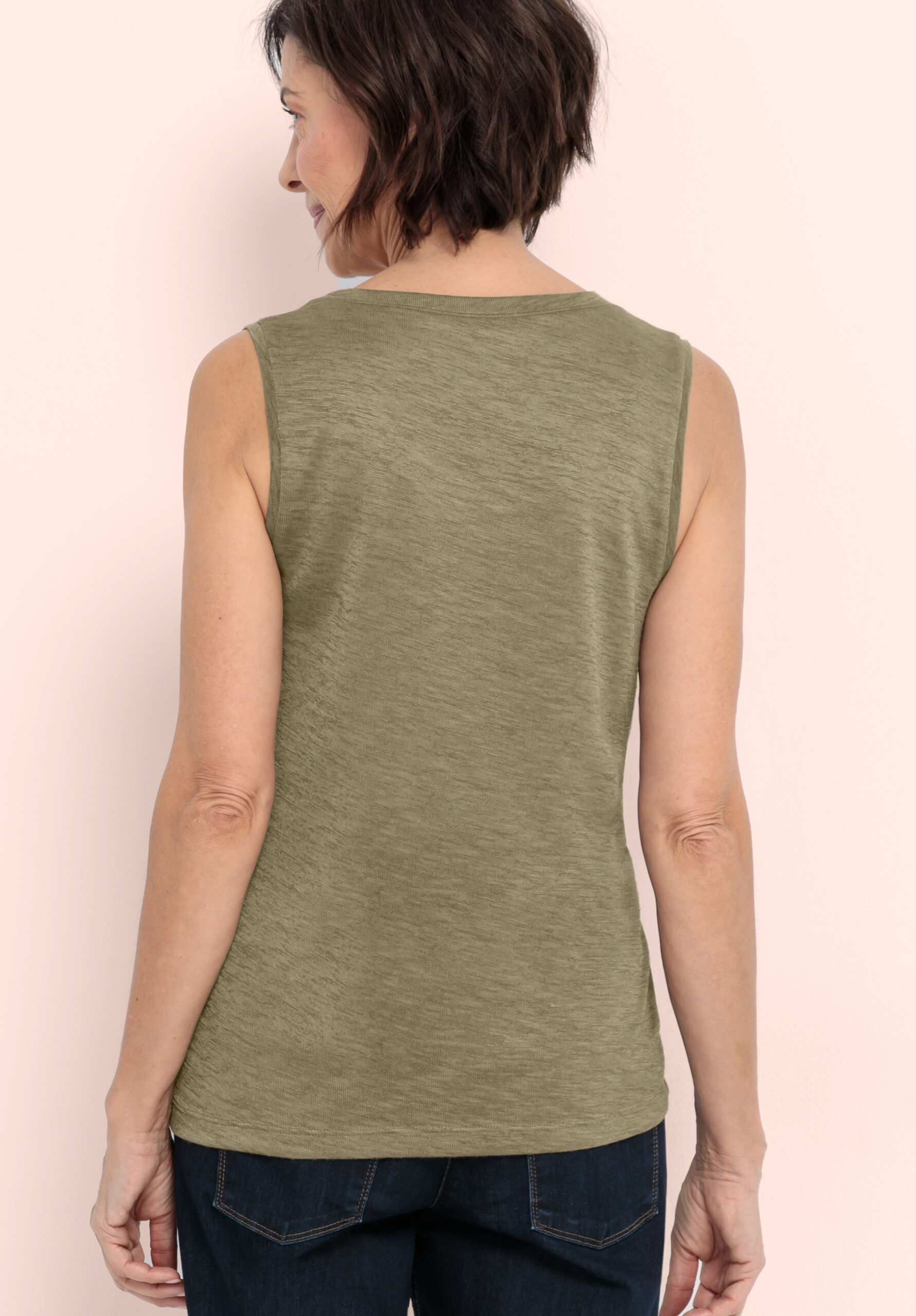 Ein eleganter Allrounder für viele Gelegenheiten! Unser Shirttop Selis zeigt sich in angesagter Trendfarbe und meliertem Feinstrick – perfekt für einen stilvollen Auftritt. Der klassische Rundhalsausschnitt, breite Träger und die gerade, lockere Passform sorgen für angenehmen Tragekomfort. Der hochwertige Materialmix rundet das Design edel ab. Kombiniert mit der passenden Strickjacke entsteht ein modernes Twin-Set mit modischer Ausstrahlung.
