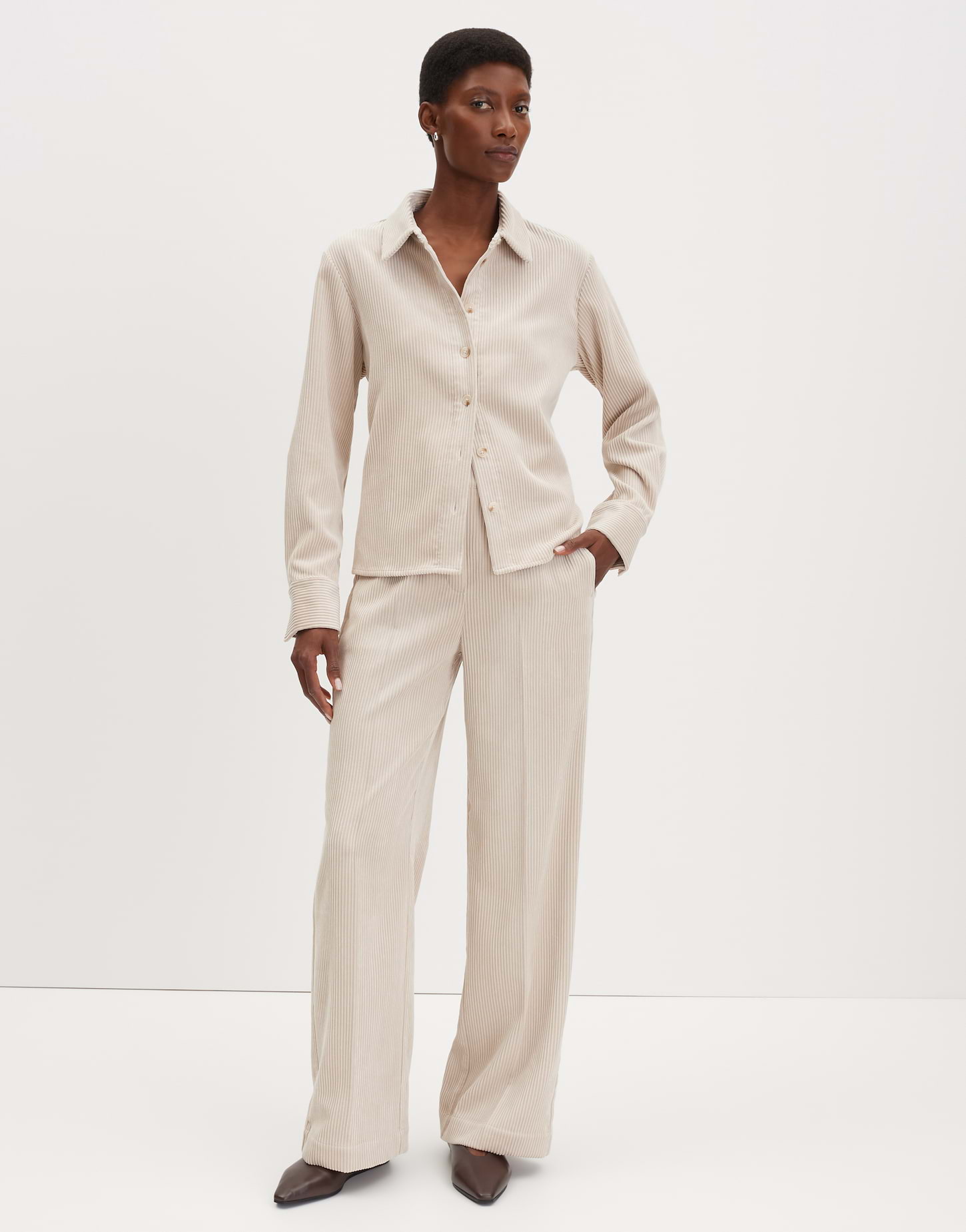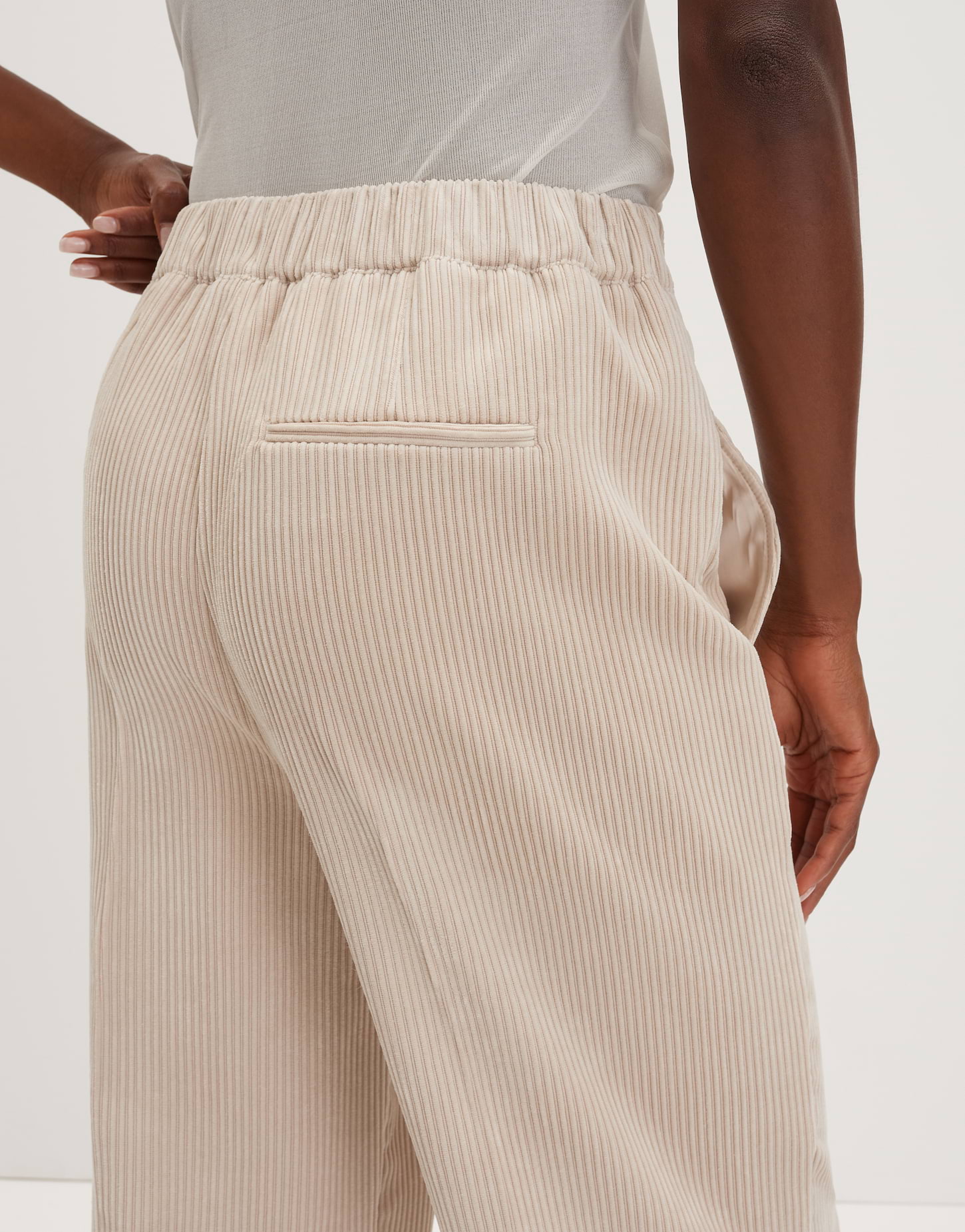 Zeitloser Cord in fließender Qualität verleiht der Hose mit weitem Bein elegante Leichtigkeit.Ein elastischer Bund betont den Mix aus Komfort und Stil, während sie in der kalten Saison mit Oversize-Strick und Lederboots ihr Fashion-Potenzial voll entfaltet.